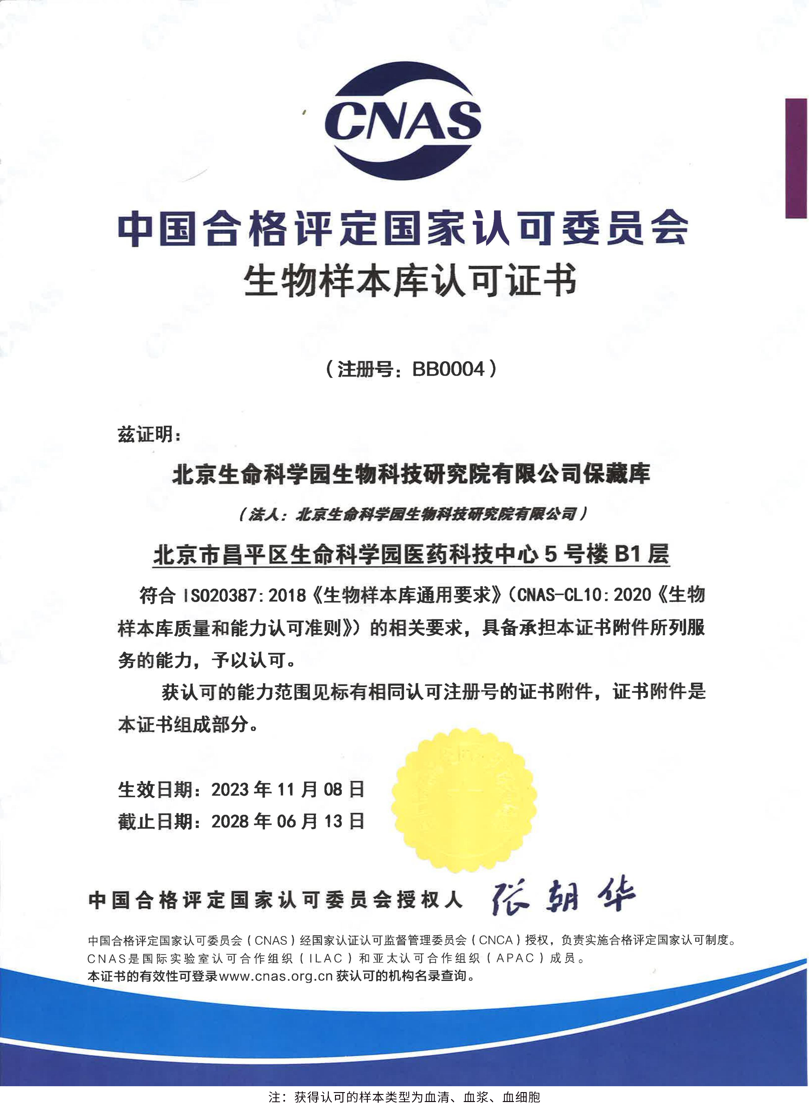 北京生命科學園生物科技研究院(以下簡稱“北京生物樣本資源庫”)(Biobank of Life Science Park,簡寫“BoLSP”)是一家由北京市科委和中關村生命科學園共同支持設立的第三方生物樣本庫公共服務平臺,秉承北京重大疾病臨床數據和樣本資源庫(以下簡稱“北京庫”)(Beijing Biobank of Clinical Resources,BBCR)十余年的發(fā)展成果,聚合眾多臨床樣本專家的專業共識,致力于在生命科學、生物醫(yī)藥研究領域發(fā)揮銜接樣本資源持有者與研究者的橋梁作用,解決生物樣本資源開發(fā)上下游信息不對稱、資源共享困難等問題。研究院在北京中關村生命科學園昌平園區建立了2000㎡生物樣本庫,最大存儲規(guī)模達1000萬份。研究院遵循CNAS-CL10:2020《生物樣本庫質量和能力認可準則》,同時結合北京庫過去十年的工作經驗與教訓,建立了一套完善的生物樣本保藏質量管理體系,從人、機、料、法、環(huán)、控多個角度,實現生物樣本保藏過程的全面質量控制,先后獲得國家科技部頒發(fā)的人類遺傳資源保藏行政許可證書和中國合格評定國家認可委員會(China National Accreditation Service for Conformity Assessment,CNAS)頒發(fā)的“CNAS認可證書”。